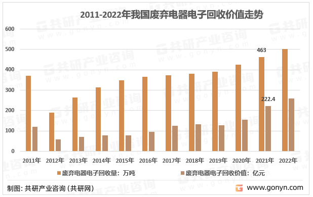 “四机一脑”作为最主要的拆解原材料,其回收量及回收价值在所有电子废弃物中占绝对优势地位。过去十年来,我国经济快速增长,带动了我国电器电子行业迅速发展,居民“四机一脑”的保有量持续增长,“四机一脑”的理论报废周期多为8-10年,因此,未来报废的电器电子产品将有望继续保持增长势头。2021年国内废弃电器电子回收量463万吨,废弃电器电子回收价值222.4亿元,2022年国内废弃电器电子回收量502万吨左右。