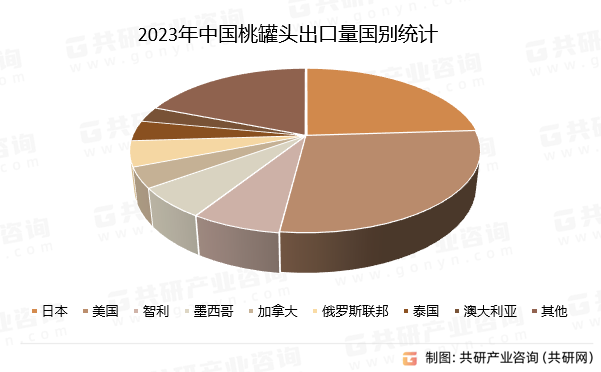 2023年1-8月,中国桃罐头出口的91个国家及地区中,出口金额前八位的国家是日本、美国、智利、墨西哥、加拿大、俄罗斯联邦、泰国和澳大利亚,其中对日本出口2.2万吨,占比24%;对美国出口2.56万吨,占比28%;对智利出口6924吨,占比7%。