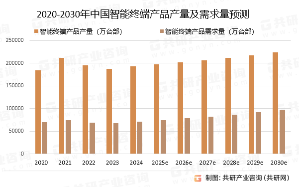 随着消费者对智能生活的追求加剧,智能终端产品作为实现智能生活的重要工具,产销量将受到消费者的积极推动。2023年,中国智能终端产品产量略增至187515.2万台部,行业需求量约67261万台部;预计到2030年我国智能终端产品产量将达到223998万台部,需求量将达到96463万台部。