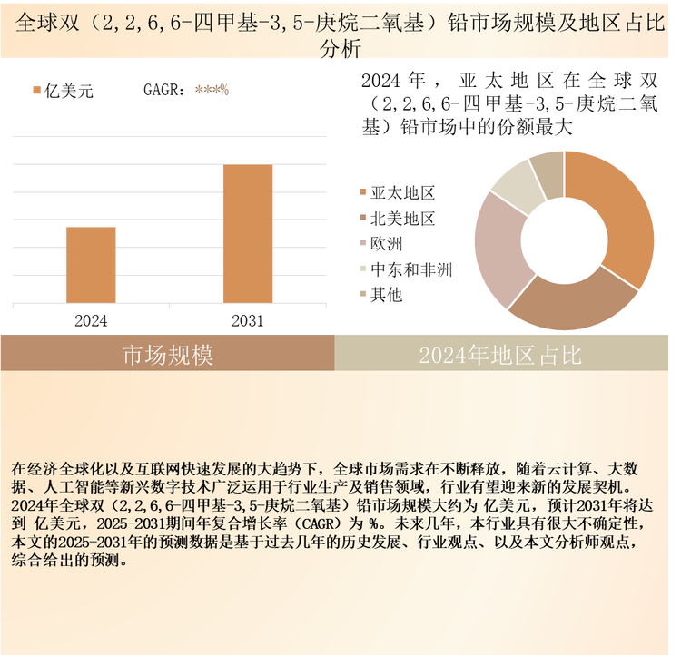 重点分析全球主要地区双(2,2,6,6-四甲基-3,5-庚烷二氧基)铅的产能、销量、收入和增长潜力,历史数据2020-2024年,预测数据2025-2031年。