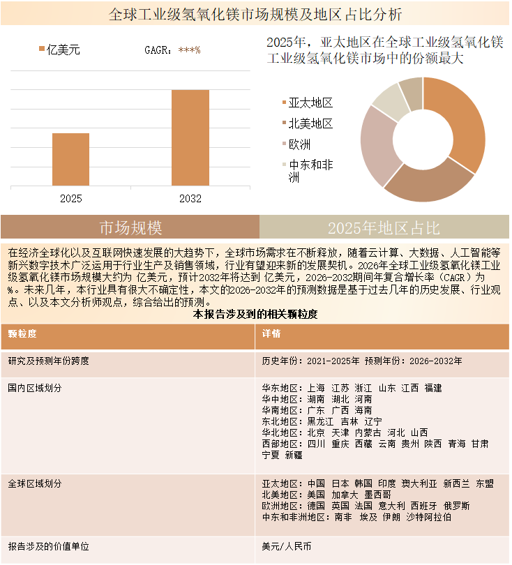 整体市场:报告不仅对全球工业级氢氧化镁行业市场容量进行统计,更对2021-2025年中国工业级氢氧化镁市场重点分析,并对2026-2032年市场发展潜力展开预测。