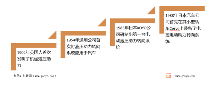 1954年,通用汽车公司首次将液压助力转向系统应用于汽车上。经过一系列的技术革新,80年代早期出现了电子液压助力转向系统。1988年,日本铃木汽车公司首先在其小型轿车Cervo上装备了电动助力转向系统。