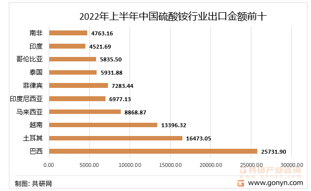 从出口金额目的地看: 2022年上半年硫酸铵主要出口巴西、土耳其、越南、马来西亚、印度尼西亚等国家,出口前十总金额为99782.92万美元。