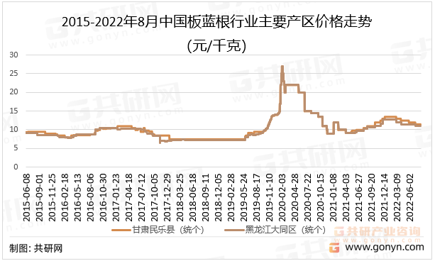 从价格走势来看,2008-2020年中国板蓝根行业均价整体呈现增长态势,2003年的非典促使板蓝根产品价格迅速上升,2009年甲型H1N1流感爆发促使行业产品价格迅速上升,产量在2009年和2010年增长也相对迅速,疫情结束后,行业价格下降明显,2020年新冠疫情爆发以来,国内主要产区板蓝根价格一度涨至27元/千克,2022年8月12日中国黑龙江大同区板蓝根(统个)价格为11元/千克,较2021年同期增加了0.8元/千克;甘肃民乐县板蓝根(统个)价格为11.5元/千克,较2021年同期增加了1元/千克。
