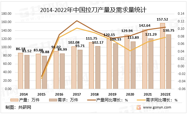 近几年,我国拉刀行业产量快速增长,从2014年的86.18万件增长到了2021年的142.64万件,国内拉刀行业市场需求快速增长,国内企业在中低端产品市场上基本满足国内市场需求,部分高端产品还需要进口,2014年国内拉刀需求量81.52万件,到2021年增长到了121.29万件。