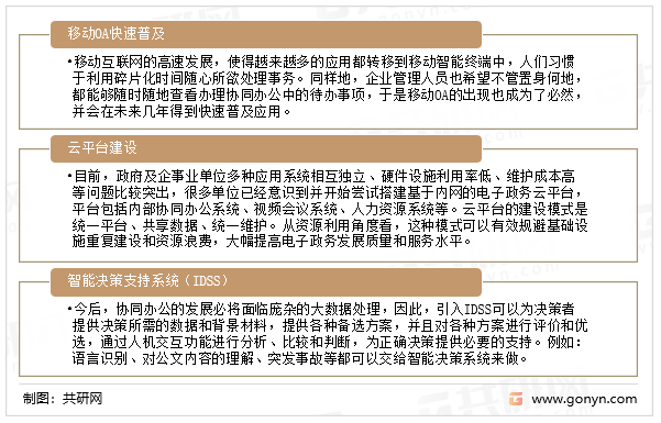 随着计算机、网络通讯和数据库这三大核心支柱技术的成熟,以及企业发展需求的强大推动力,协同办公未来发展将进入到新的层次,更加智能化和集约化。