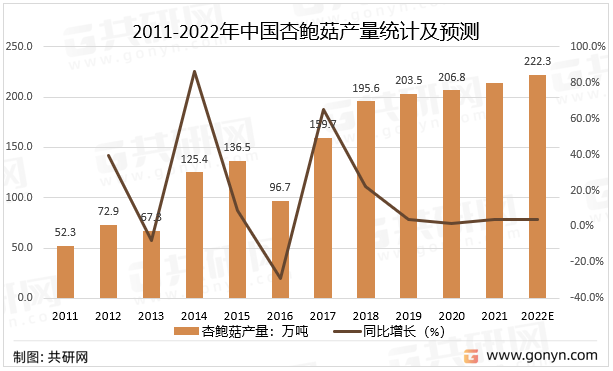 杏鲍菇主要分布南欧、意大利、西班牙、法国、德国、捷克斯洛伐克、匈牙利、原苏联南方、北非、摩洛哥等,印度、巴基斯坦以及我国的新疆、青海和四川北部也有分布,2020年中国杏鲍菇产量达206.76万吨,同比增长1.6%,预计2022年中国杏鲍菇产量将达到222.3万吨。