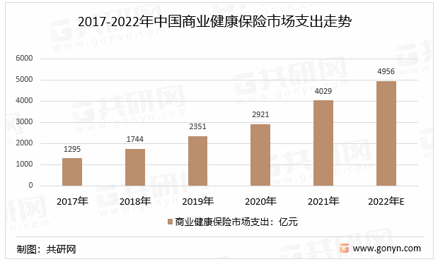 2017年以来,中国商业健康保险市场支呈逐年增长趋势,2021年中国商业健康保险支出为4029亿元,预计2022年中国商业健康保险市场支出有望达到4956亿元。
