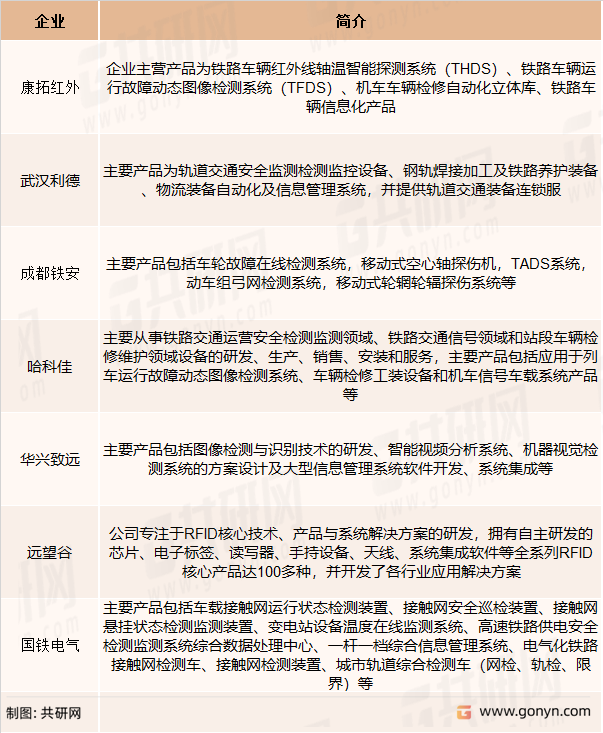 轨道交通安全监测检测类产品指用于铁路运行安全监测检测的相关产品,综合运用红外线温度探测、机器视觉、光学测量、振动与声学检测、RFID 射频识别、力学检测等技术,通过数据采集、建模分析过程,具有动态检测、数据集中、联网运行、远程监控、信息共享等特点,实现安全预警和报警。