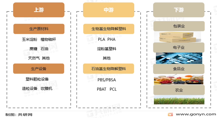 可降解塑料上游包括生产原材料和生产设备,生产原材料包括玉米淀粉、植物秸秆、蔗糖、石油、天然气等,生产设备包括塑料颗粒设备、造粒设备、吹膜机等,广泛应用于包装、电子、农业、食品等领域。