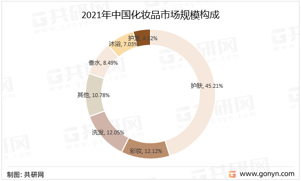 其中,护肤规模约1820亿元,占45.21%,占比非常大;彩妆规模约488亿元,占12.12%;洗发规模约485亿元,占12.05%;香水规模约342亿元,占8.49%;沐浴规模约283亿元,占7.03%;护发规模约174亿元,占4.32%。