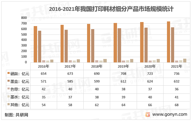 2012-2021年我国打印耗材细分产品市场规模统计