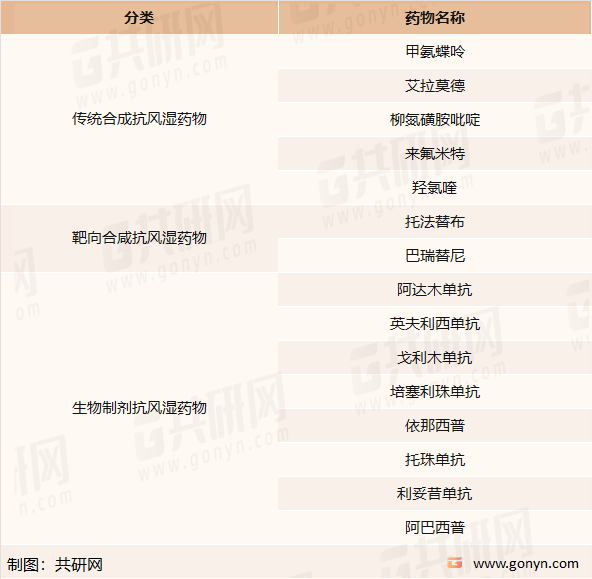 类风湿关节炎(RA)是一种病因未明的慢性、以炎性滑膜炎为主的系统性疾病。其特征是手、足小关节的多关节、对称性、侵袭性关节炎症,经常伴有关节外器官受累及血清类风湿因子阳性,可以导致关节畸形及功能丧失。目前类风湿关节炎主要治疗药物包括非甾体类抗炎药物(NSAIDs)、改善病情的抗风湿药物(DMARDs)、糖皮质激素、植物药物等。抗风湿药物又分为传统合成抗风湿药物(csDMARDs)、生物制剂抗风湿药物(bDMARDs)和靶向合成抗风湿药物(tsDMARDs)。