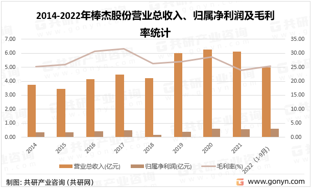 2014-2022年棒杰股份营业总收入、归属净利润及毛利率统计