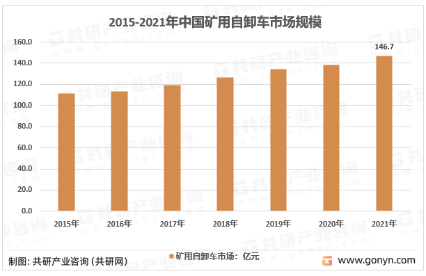 宽体矿车是矿用卡车的一种,又称非公路矿用自卸车,是结合了重型卡车和工程机械技术基础进行系统设计制造的自卸车。作为在特定工况下的装载运输设备,宽体矿车主要应用在露天煤矿、金属矿、建材矿以及大型工程,是矿山设备中最为主要的产品之一。2021年中国矿用自卸车市场规模146.7亿元。