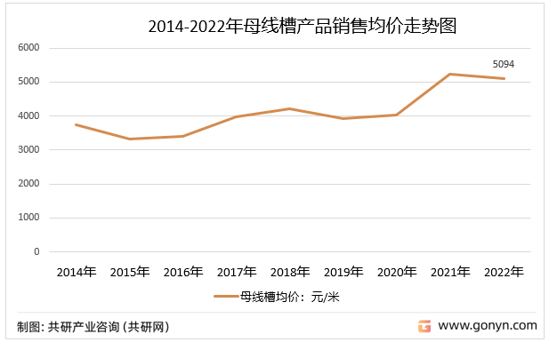 2021年随着上游铜铝原材料价格的攀升,国内母线槽产品价格增长明显,2021年我国母线槽产品销售均价为5225元/米;2022年我国母线槽产品均价为5094元/米。