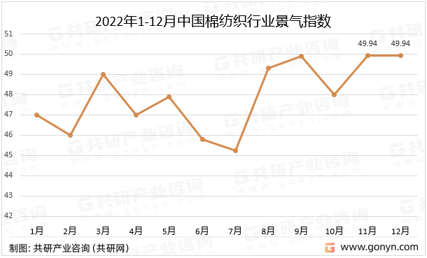 2022年我国棉纺织景气指数全年位于荣枯线下方,行业持续处于欠景气状态,2022年7月份中国棉纺织景气指数跌至全年最低点45.23;12月,中国棉纺织景气指数为49.94,较11月上升2.79,为全年最高值,行业景气水平维持回升态势。从分项指数看,构成中国棉纺织景气指数的7个分项指数中,除生产指数较11月下降外,其余指数均较11月上升。