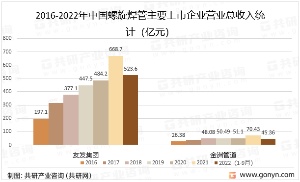 2016-2022年中国螺旋焊管主要上市企业营业总收入统计