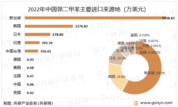 从进口来源地来看,2022年我国邻二甲苯主要从新加坡、韩国、日本、印度、中国台湾等地进口邻二甲苯,进口额分别为3738.83万美元、1276.82万美元、678.80万美元、393.70万美元和356.65万美元。