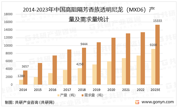 2014-2023年中国高阻隔芳香族透明尼龙(MXD6)产量及需求量统计