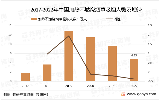 2017-2022年中国加热不燃烧烟草吸烟人数及增速