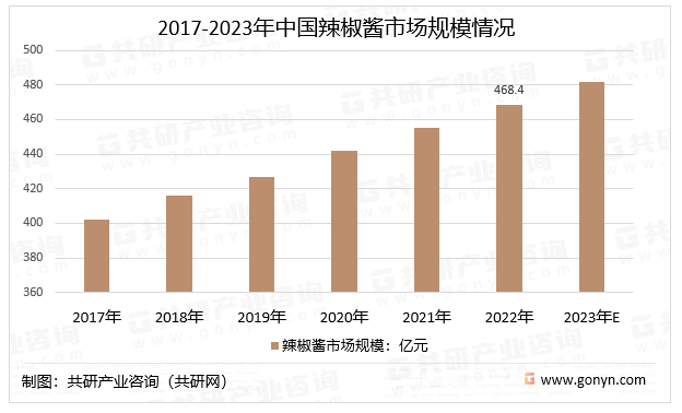 辣椒酱是用辣椒制作成的酱料,是餐桌上比较常见的调味品。近年来,辣椒酱市场持续保持着增长趋势,2022年中国辣椒酱市场规模增长至468.4亿元,较2021年增长12.9亿元,预计2023年中国辣椒酱市场规模将达到481.7亿元。