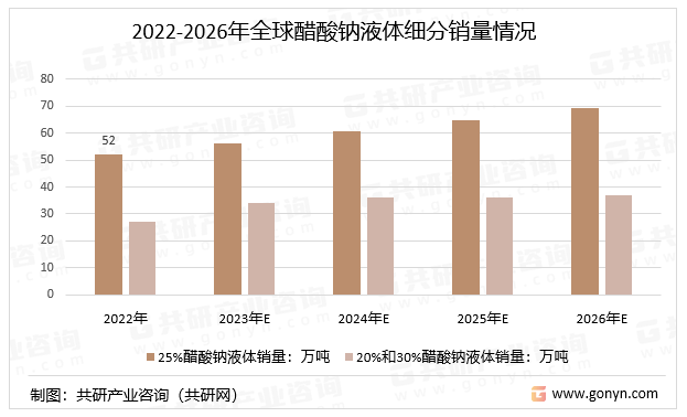 醋酸钠液体按含量可以分为20%醋酸钠液体、25%醋酸钠液体和30%醋酸钠液体,其中,含量为25%的醋酸钠液体占据主导地位。2022年全球25%醋酸钠液体销量52万吨,20%和30%醋酸钠液体销量合计27.19万吨;预计2023年全球25%醋酸钠液体销量56.29万吨,20%和30%醋酸钠液体销量合计33.92万吨。