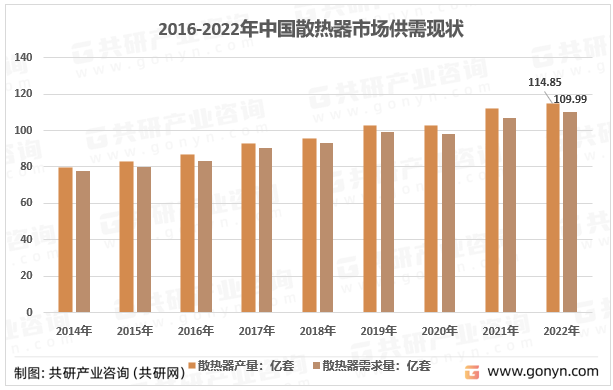 近年来我国手机行业、通信技术行业、汽车行业发展较快,对散热器市场需求体量也日益增加。2022年国内散热器产销量达114.85、109.99亿套。