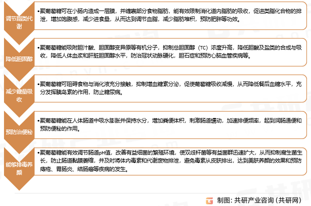 聚葡萄糖除具有不溶性膳食纤维所特有的明显增加粪便体积、增强通便、降低肠道癌的风险等的作用外,还具有不溶性膳食纤维所不具备或不明显的功能,如结合清除体内的胆酸,明显降低血清胆固醇,更容易引致饱腹感,能明显降低饭后血糖水平等。