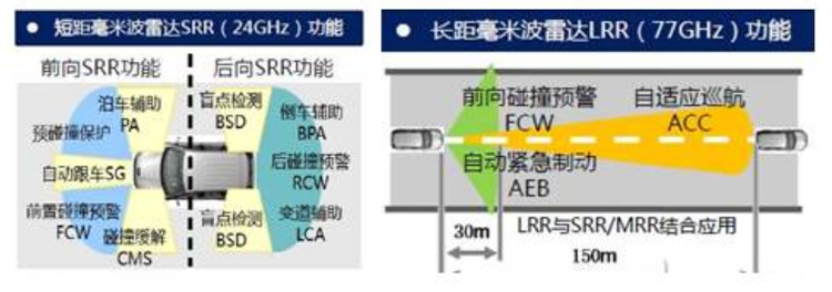 车载毫米波雷达是一种通过发射和接收毫米波信号来实现环境检测和车辆控制的技术。其基本工作原理是利用毫米波的特性进行环境检测和测距,进而实现车辆的自主导航和安全控制。24GHz和77GHz是汽车应用最广泛的雷达,24GHz主要面向5-70m的中短距探测,主要应用有盲点检测、车道偏离预警、车道保持辅助、变道辅助、停车辅助等,而77GHz主要面向100-250米的中长距探测,例如自适应巡航(ACC)、前向碰撞预警(FCW)、自动刹车辅助(AEB)等。