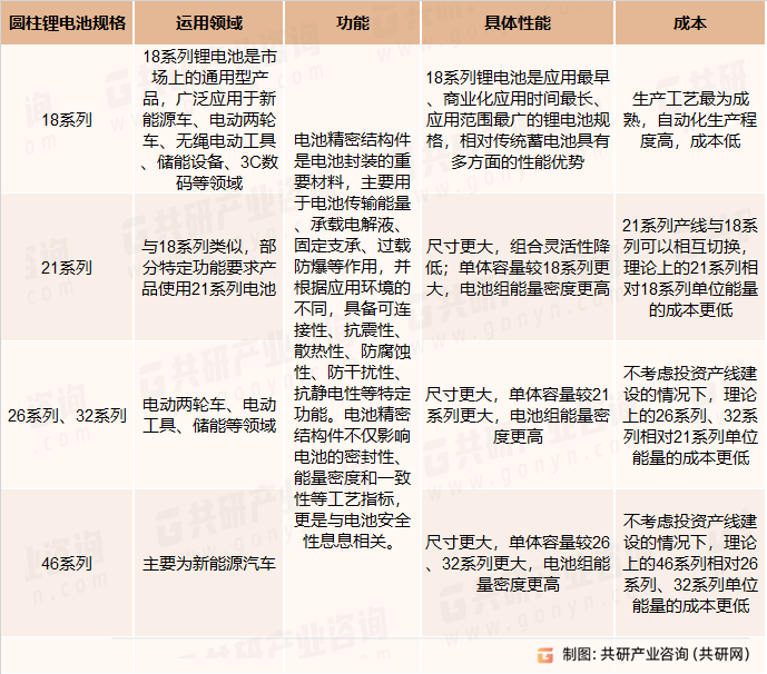 18系列锂电池是商业化应用时间最长、应用范围最广、生产工艺最为成熟的圆柱锂电池型号,21系列、26系列、32系列、46系列均系在18系列基础上,根据特定应用领域的需求开发而来的产品类型。上述各型号圆柱锂电池均有其各自应用的优势领域。小动力等领域,18系列作为普遍使用的产品型号,21系列、26系列作为补充,相关电池型号电池需求量将随着下游电动工具、电动两轮车、智能家居、便携式储能市场快速发展而增长;大动力领域,随着国内厂商电池管理技术的成熟及特斯拉46800电池的推广,18系列、21系列、46系列等圆柱锂电池型号在大动力领域的应用有望实现增长。