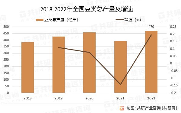 豆类中的主要营养成分包括碳水化合物、蛋白质和脂肪等。豆类中的蛋白质是豆类的重要组成成分。2021年,全国豆类总产量393亿斤,比2020年减少65亿斤,同比下降14.19%;2022年,全国豆类总产量470亿斤,比2021年增加77亿斤,同比增长19.59%。
