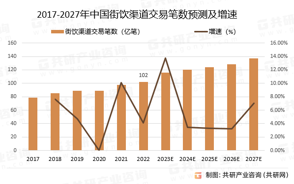 2017-2027年中国街饮渠道交易笔数预测及增速
