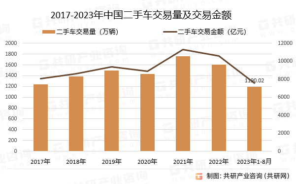 2022年,全国二手车市场累计交易量1602.78万辆,累计交易金额为10595.91亿元。2023年1-8月,全国二手车累计交易量1190.02万辆,同比增长13.38%,与同期相比增加了140.41万辆,累计交易金额为7557.51亿元。未来,随着消费者的二手车接受度不断提高,以及政府政策对于促进二手车交易的支持,二手车交易行业规模预计将继续保持增长态势。未来随着汽车整体保有量的逐渐饱和,二手车交易增长速度将逐渐趋缓,但整体规模仍将保持稳定增长。