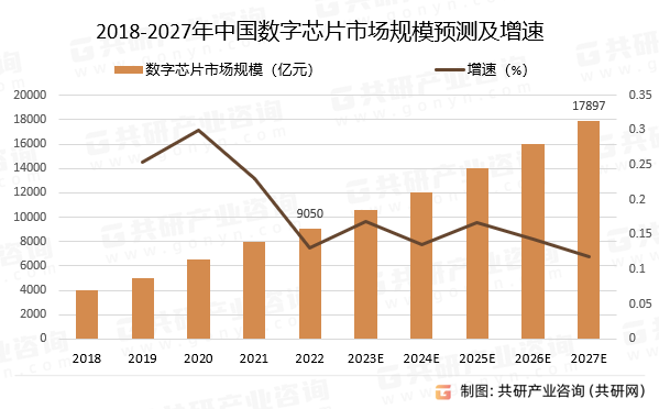IoT市场的增长使中国数字芯片市场规模从2018年的3986.0亿元增长至2022年的9050.0亿元,年复合增长率达22.8%。未来,智能终端的持续普及将继续带动数字芯片市场规模的增长,预计从2023年的10572.1亿元增长至2027年的17897.0亿元,年复合增长率达14.1%。