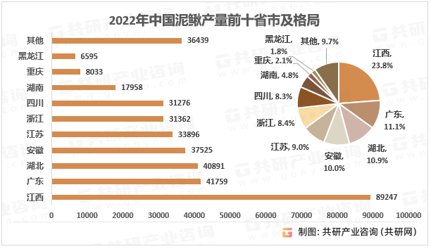 目前养殖的泥鳅苗种来源于野生苗种和人工繁育苗种目前,泥鳅养殖已经从单一培养方式,到如今开发了一种生态有效的育苗方法,利用水荠和水獭等水生生物与泥鳅共同生存,大大提高了生存率。2022年我国泥鳅养殖产量374981吨,其中江西省泥鳅养殖产量89247吨,占比全国产量23.8%,位居全国第一,广东省泥鳅养殖产量4175吨,占比全国产量11.1%,湖北泥鳅产量40891吨,占全国产量10.9%。