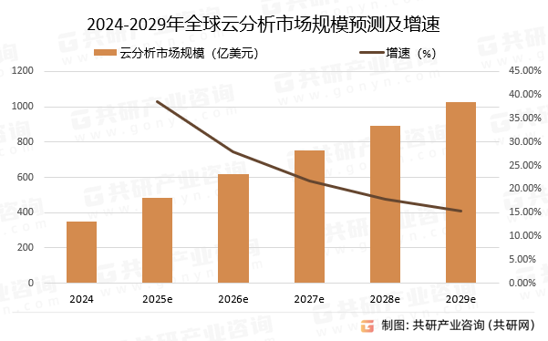 得益于人工智能(AI)、机器学习(ML)与云计算的深度融合,以及企业对数据驱动决策需求的提升,全球云分析市场需求不断提升。2024年,全球云分析市场规模为350亿美元,预计到2029年云分析市场规模将增至1026亿美元。