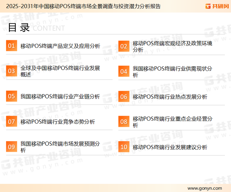 共研产业研究院通过对公开信息分析、业内资深人士和相关企业高管的深度访谈,以及分析师专业性判断和评价撰写了《2025-2031年中国移动POS终端市场全景调查与投资潜力分析报告》。本报告为移动POS终端企业决策人及投资者提供了重要参考依据。
