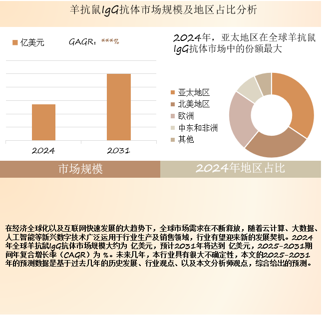 2024年全球羊抗鼠IgG抗体市场规模大约为 亿元(人民币),预计2031年将达到 亿元,2025-2031期间年复合增长率(CAGR)为 %。未来几年,本行业具有很大不确定性,本文的2025-2031年的预测数据是基于过去几年的历史发展、行业观点、以及本文分析师观点,综合给出的预测。