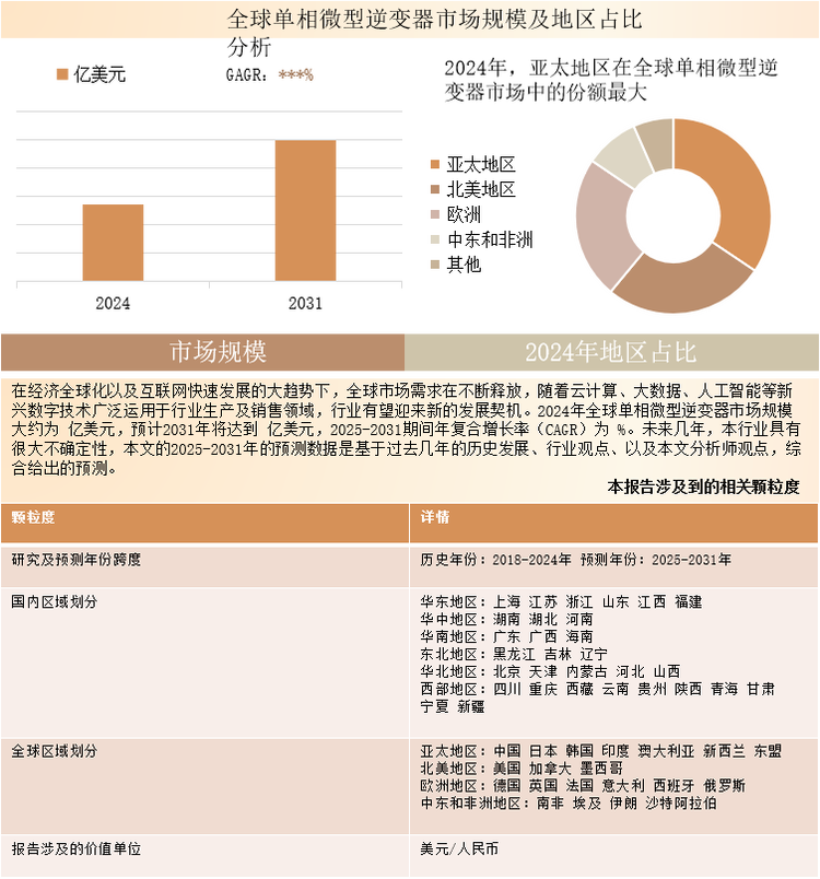 整体市场:报告不仅对全球单相微型逆变器行业市场容量进行统计,更对2020-2024年中国单相微型逆变器市场重点分析,并对2025-2031年市场发展潜力展开预测。