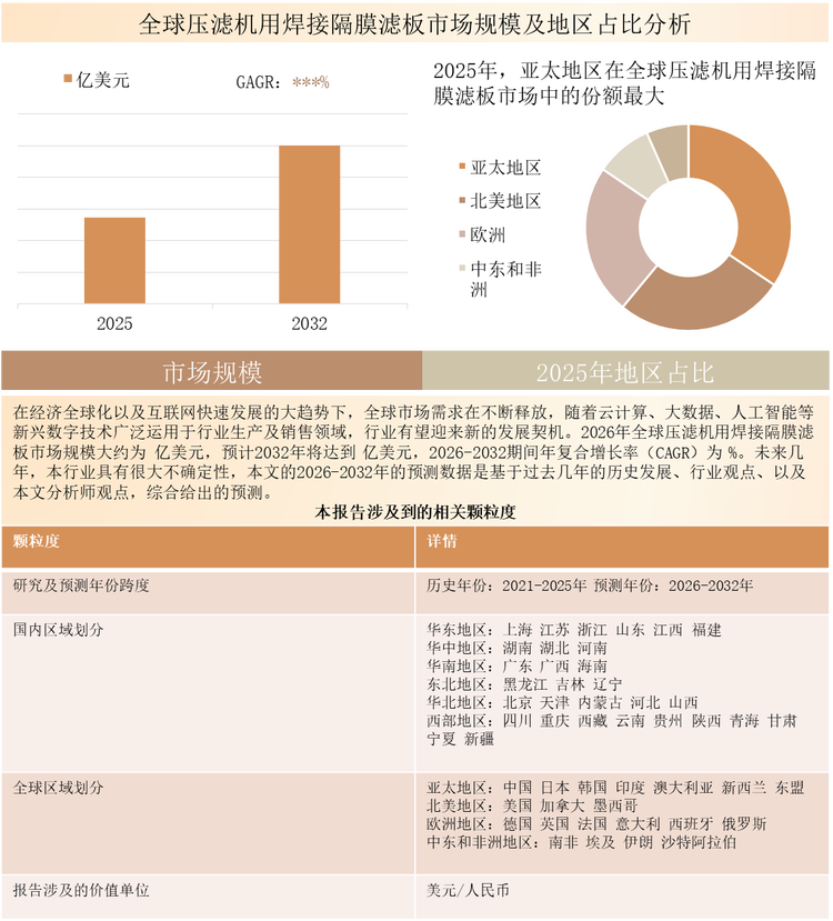整体市场:报告不仅对全球压滤机用焊接隔膜滤板行业市场容量进行统计,更对2021-2025年中国压滤机用焊接隔膜滤板市场重点分析,并对2026-2032年市场发展潜力展开预测。